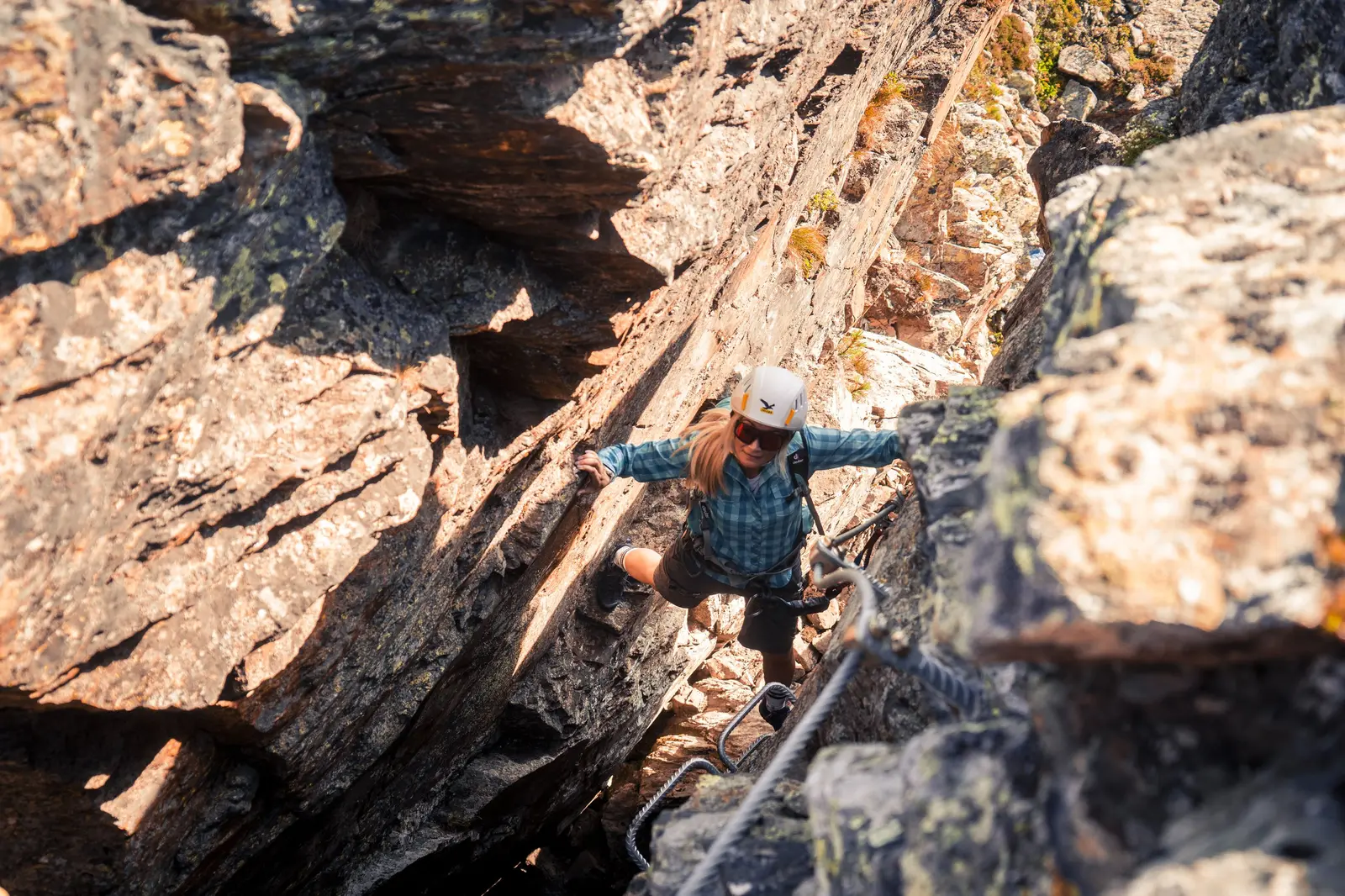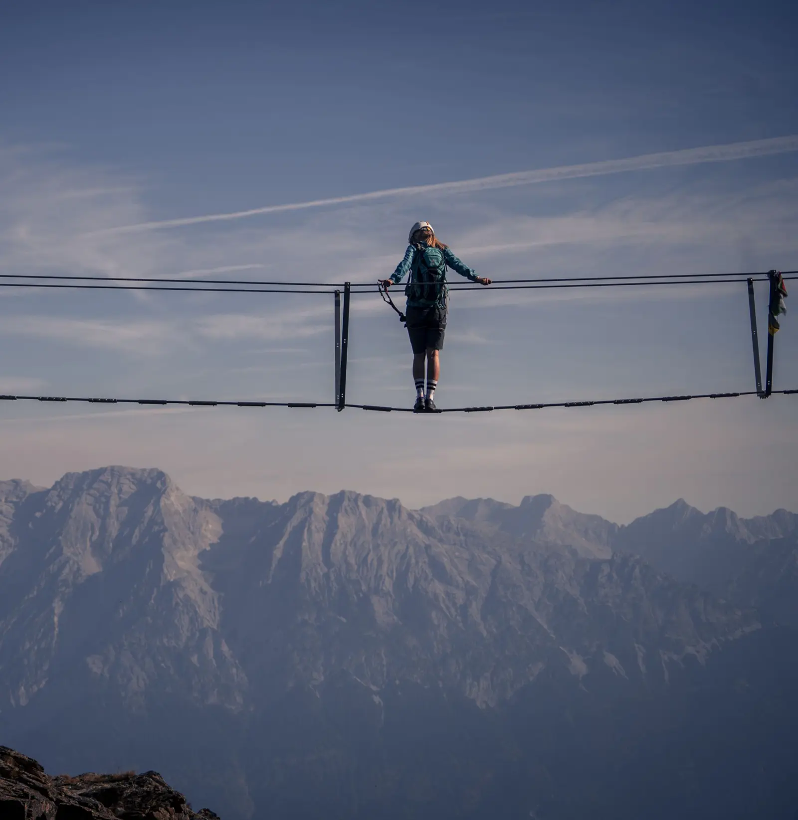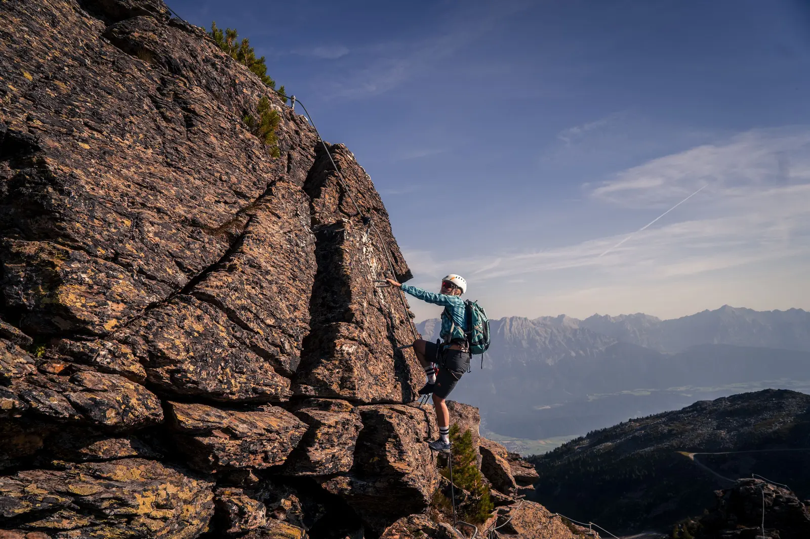 Wer sich unsicher fühlt oder keine eigene Ausrüstung besitzt, kann sich an der Talstation der Glungezerbahn mit Klettersteigset, Gurt und Helm ausstatten – und einen Guide hinzuziehen.