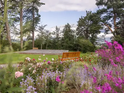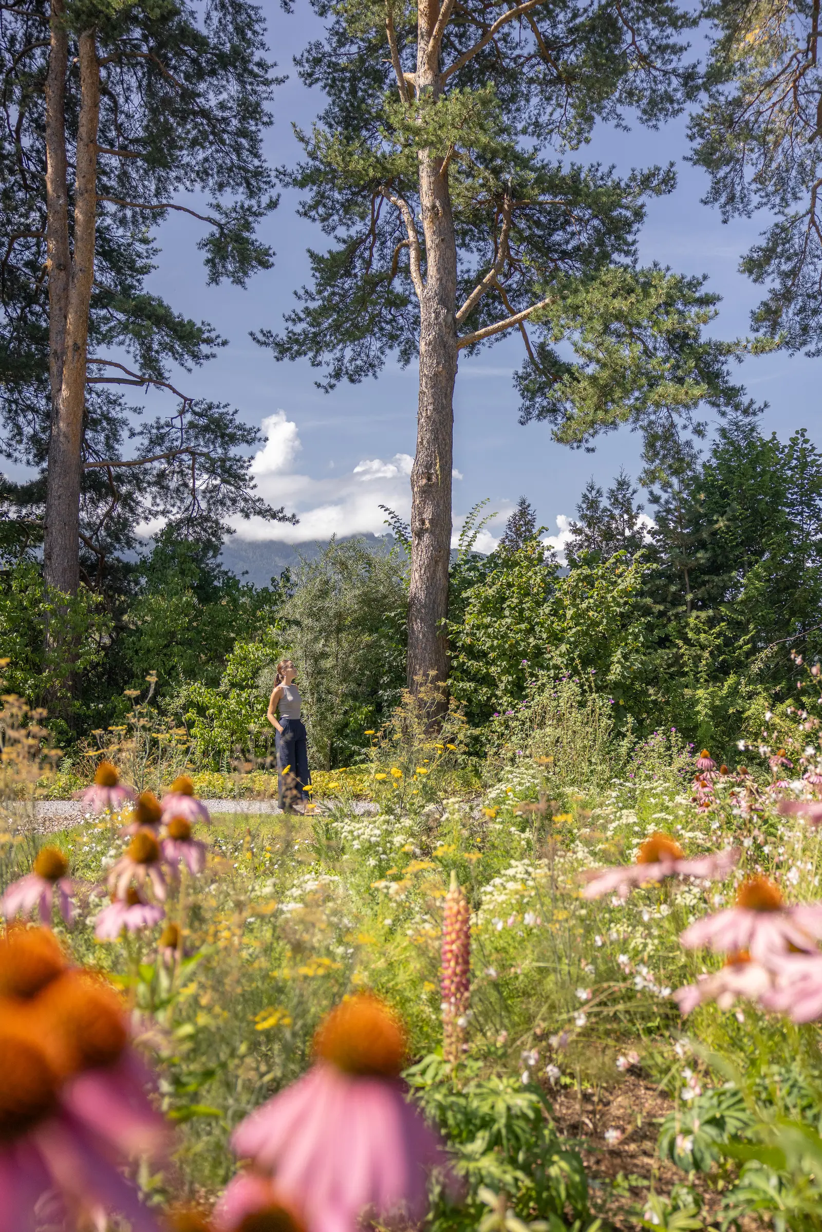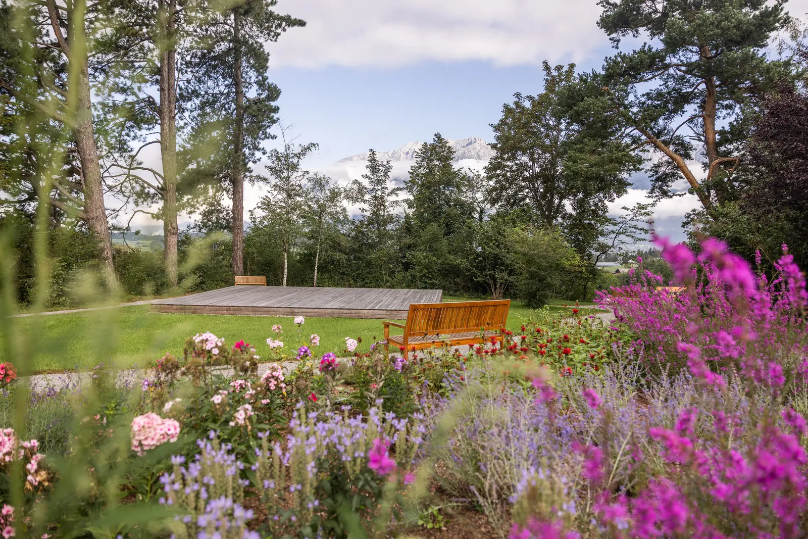 Auf liebevoll angelegten Kieswegen spaziert man morgens durch den Park, während die zahlreichen Vögel fröhlich zwitschern. Kräuterbeete säumen den Weg, Lavendel, Rosen und Feldblumen spenden Farbe und Wohlgeruch. Und immer wieder bieten sich Ausblicke in das gewaltige Bergpanorama der Tiroler Alpen.