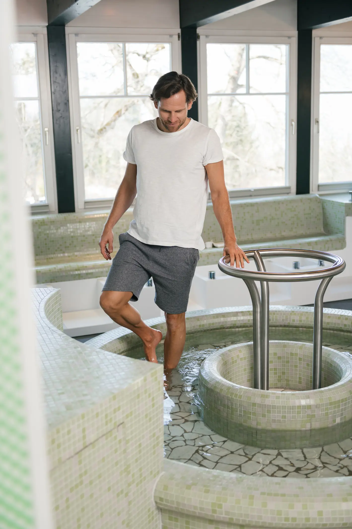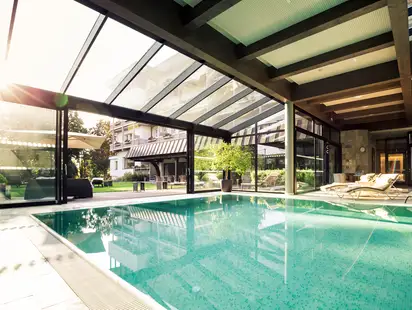 Einsam im Becken seine Bahnen ziehen oder gemeinsam bei Wassergymnastik den Körper aktivieren. Frühmorgens die sanften Sonnenstrahlen tanken oder abends vor dem Schlaf Körper und Geist entspannen – der herrliche Indoorpool ist ein wahrer Traumplatz im Park Igls. Bei Schönwetter werden die großen Glastüren geöffnet und eine herrliche Brise durchflutet das Hallenbad.