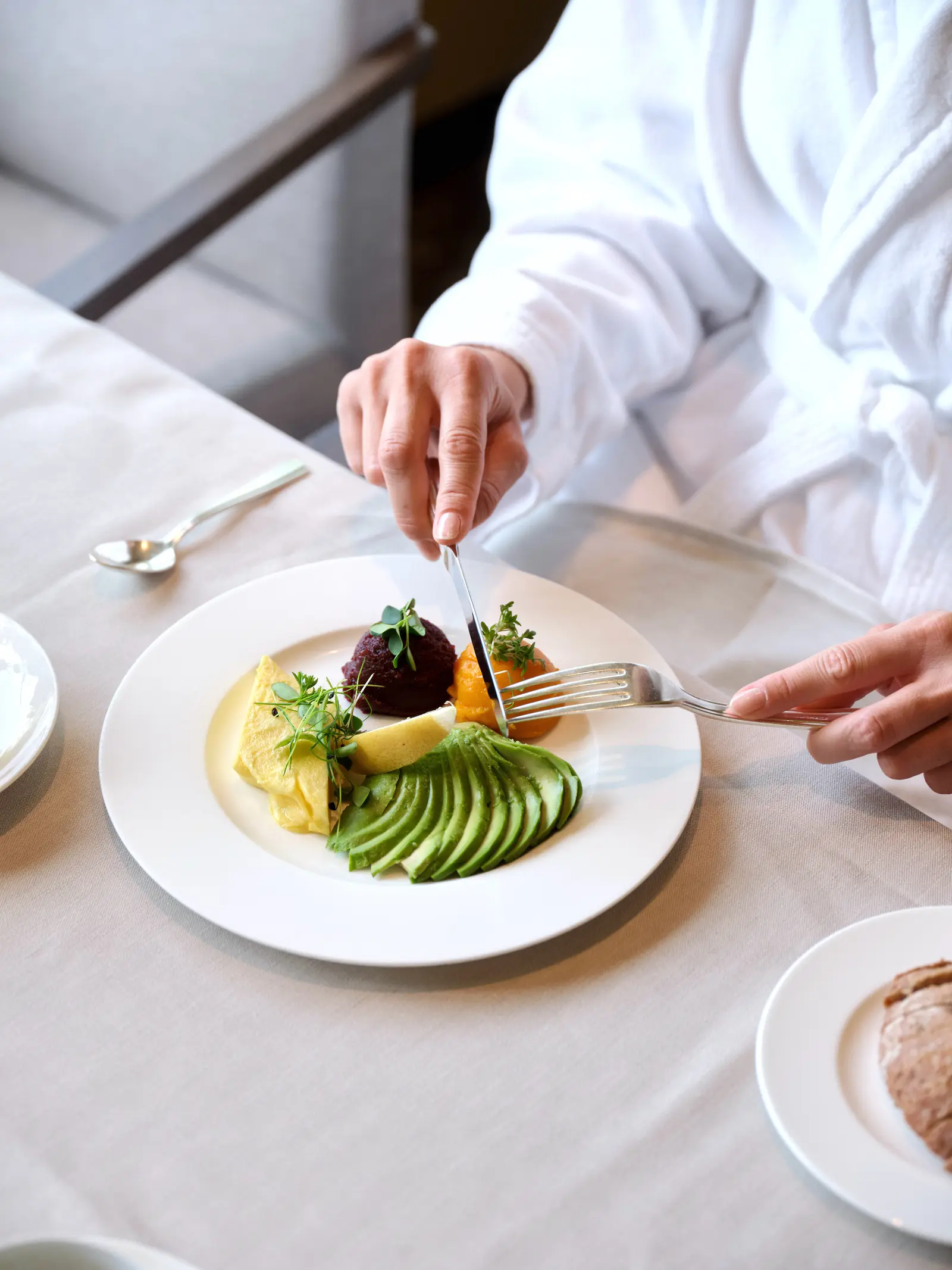 Für die erste Mahlzeit am Tag plane ich mir genug Zeit ein. Denn: Achtsames Essen ist wichtig! Jeder Bissen soll mindestens 30-mal gekaut werden – das ist gewöhnungsbedürftig, aber ein Erfolgsgarant. Auf Zwischenmahlzeiten verzichte ich während des gesamten Aufenthalts komplett.